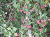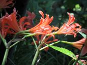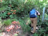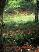 8月24日 角田山 今年はキツネノカミソリを見ないお盆休みになっちゃったな、と思っていたが、ダンナが日曜だけがお休みの週末だったので、まだ咲き残っていてくれと期待して角田山に登った。 しかし、今年の暑さをナメていた。 例年、角田山にキツネノカミソリのシーズンに登りに来ているのだが、こんなに過酷だったっけと思った。 とにかく、暑い。 暑くて暑くてしかたない。 汗だらだら流しながら登る。 キツネノカミソリに出合うまでにすでに体力消耗しきっている。 さて、お目当てのキツネノカミソリだが、ほとんど終わっていて、あたりが真っ赤になるような光景は見られなかったのだが、まだけっこうな数が咲いていてくれた。 それにつけても、暑い。 いつもは楽に登れる坂道がとんでもなくキツく感じられる。 三歩歩いては息をつき、二歩歩いては立ち止まる感じだ。 やっとの思いで山頂園地に着く。 いつもならこの先の観音堂まで行って昼食にするのだが、あそこは日陰が少ない。 観音堂に行くのはやめて、山頂園地の木陰で昼食にした。 帰りも汗だらだら、やぶ蚊に追いかけられながら下山。 それから、ダンナが人づてに聞いたお寺の裏手にあるキツネノカミソリの群生地に行って見ることに。 ここは、ホントーに見事に咲いていた。 なにせ、駐車場から0歩で群生が見られる場所である。 汗ダラダラで行った角田のあとでは、もうキツネノカミソリは毎年ここに見に来ればいいや、と思ってしまった。 どこのお寺かは、検索すると分かると思うので、調べてみてね。 下は本日の角田の様子。 けっこう下からキツネノカミソリが咲いていた。 ヤブランもたくさんありましたよ。オヤマボグチはまだこれから。 右は、ツリガネニンジンかしらね。 なぜか一部だけ赤く紅葉しているモミジがあった。 で、ハギも咲いている。くそ暑いのに。 右はスズメバチの巣。木のうろにびっしり詰まっていて、スズメバチが飛んでいた。 登山者が気をつけて、と教えてくれた。 角田山(浦浜コース) 9時49分 駐車場出発。 10時05分 一合目。 10時20分 三合目。 10時41分 五合目。 10時57分 ベンチ。 11時03分 五ケ峠コース分岐。 11時15分 灯台コース分岐。 11時20分 三望平園地。 11時35分 山頂。昼食休憩。 12時21分 下山開始。 12時38分 三望平園地。 12時42分 灯台コース分岐。 12時51分 五ケ峠コース分岐。 12時56分 ベンチ。 13時08分 五合目。 13時26分 三合目。 13時37分 一合目。 13時49分 駐車スペース到着。 ↑ページのトップへ |